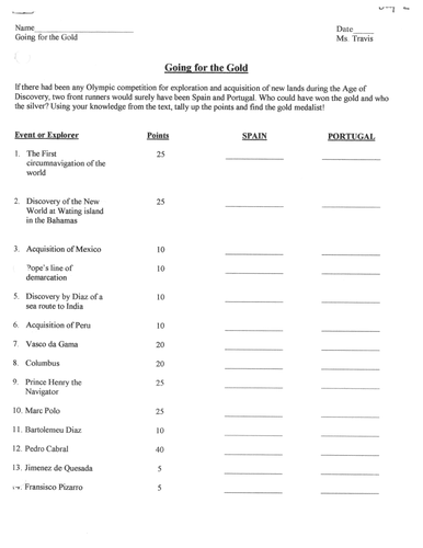 Students classify whether the explorer/ act was by spain or portugal and eventually add up the scores to see whether or not spain or portugal was the leading power during the age of discovery.